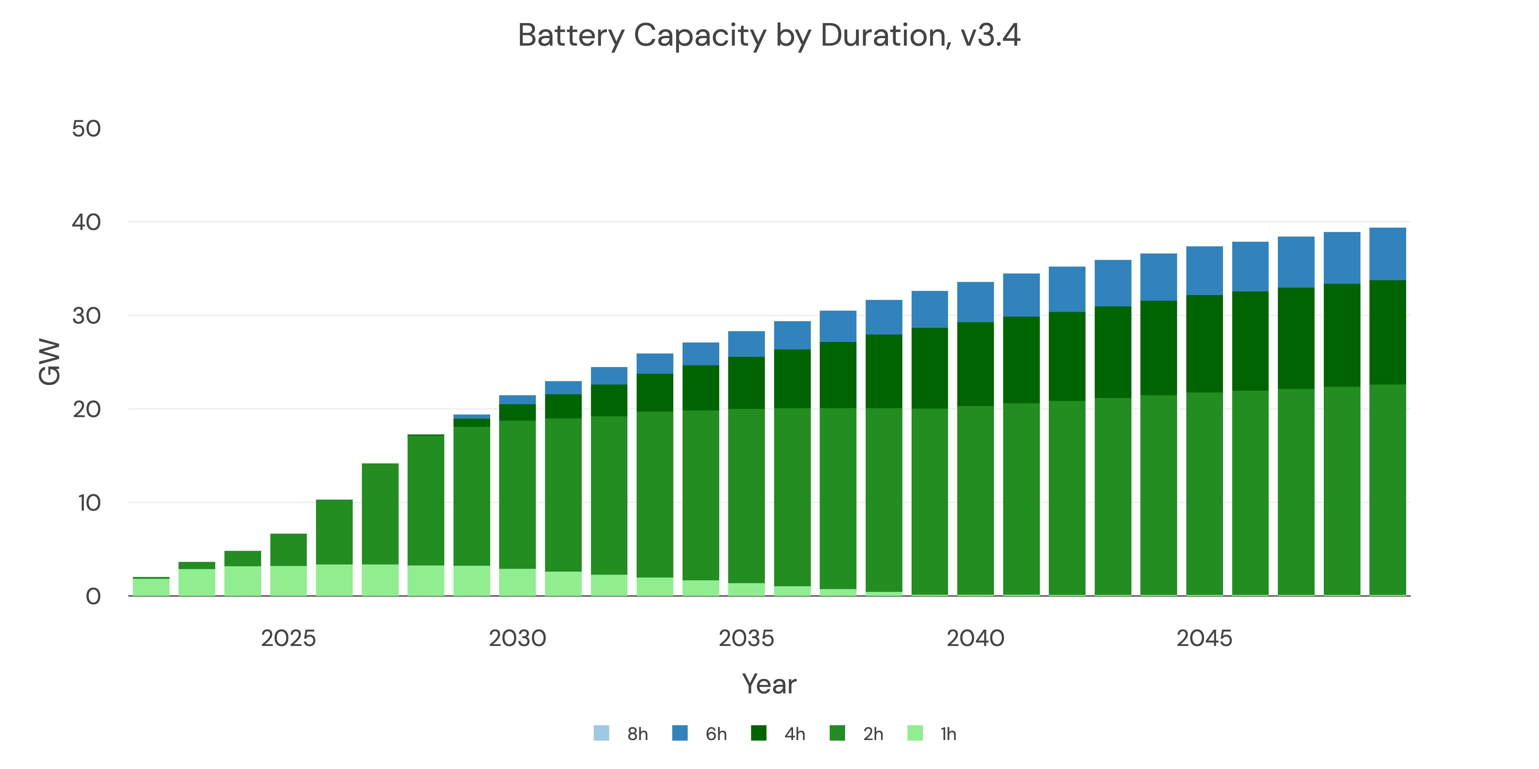 We assume no new 1-hour systems get built, and the existing 1-hour fleet get augmented to 4-hour systems from 2030 onwards.