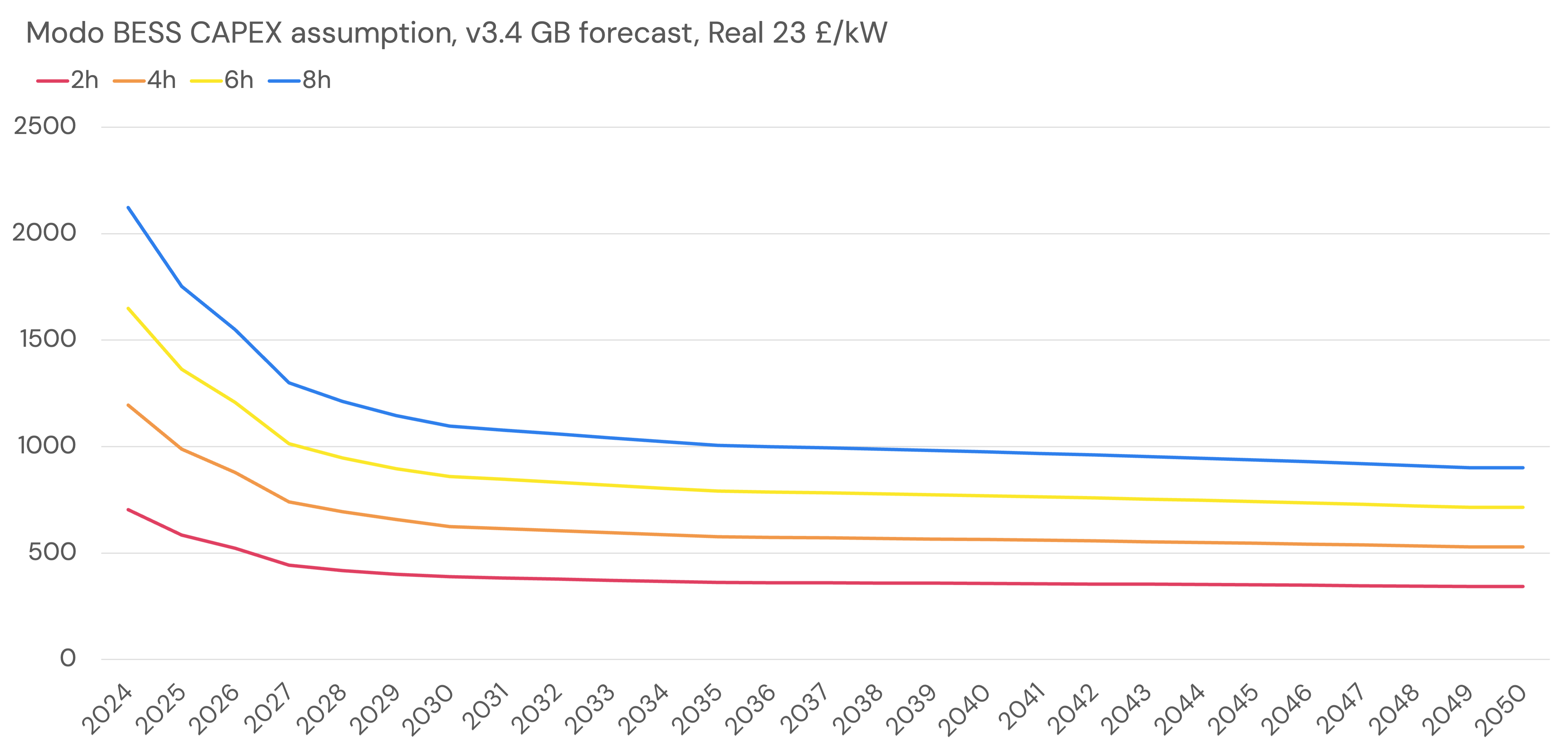 Major battery manufacturers (CATL, for example) announced dramatic drops in the cost of their systems in the first half of 2024. In November 2024, Modo conducted a survey covering 2.8 GW of battery energy storage projects - with commissioning dates from 2024 to 2028. 30 responses detailed costs from the GB storage industry on the CAPEX of their previous or next project. These responses inform our shorter duration CAPEX assumptions and for each additional hour of duration we assume £100/kW in 2025, with a learning rate. Costs are adjusted to Real 2023 values.